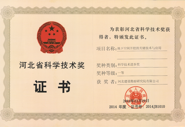 2015年2月26日,省委、省政府在石家莊召開全省科技創新暨科學技術獎勵大會,省委書記、省人大常委會主任周本順,省委副書記、省長張慶偉出席會議并講話。會上,副省長許寧宣讀了省政府關于2014年度河北省科學技術獎勵的決定,公布了獲獎項目(人員)名單。我公司申報的項目“地下空間開挖的關鍵技術與應用”榮獲2014年度河北省科學技術進步獎一等獎。
