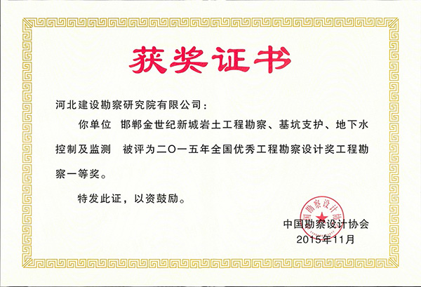 近日,公司兩項工程分別榮獲2015年度全國優秀工程勘察設計工程勘察一、二等獎.一等獎:邯鄲金世紀新城巖土工程勘察、基坑支護、地下水控制及監測;二等獎:河北開元環球中心巖土工程勘察。