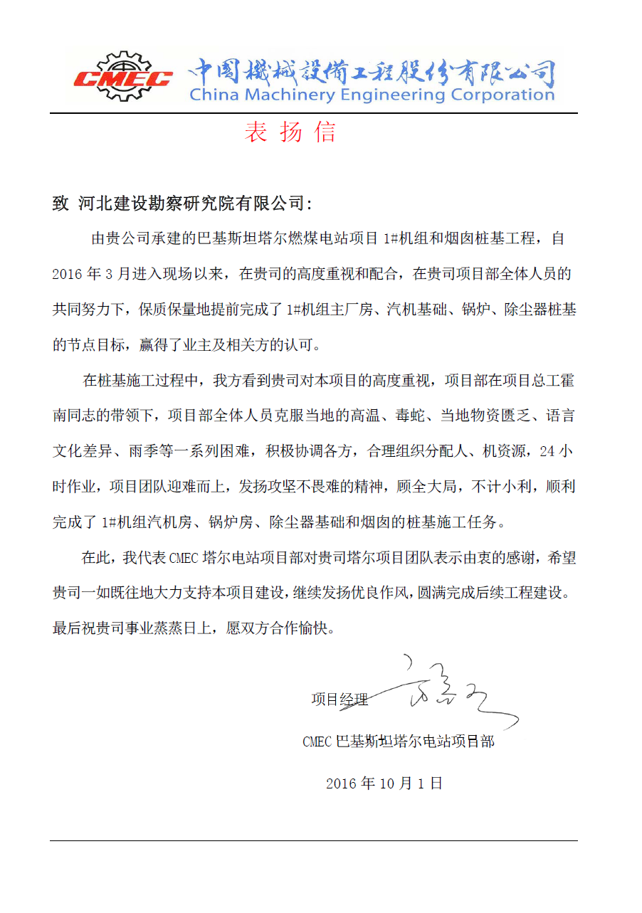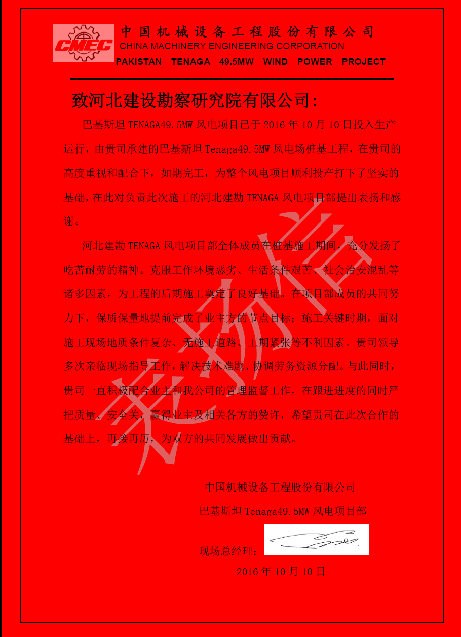 由我公司承建的巴基斯坦塔爾燃煤電站項目1#機組和煙囪樁基工程和巴基斯坦Tenaga49.5MW風電項目,項目部全體人員在項目總工霍南的帶領(lǐng)下,克服工作環(huán)境惡劣、生活條件艱苦等一系列困難,積極協(xié)調(diào)各方,合理組織分配資源,順利完成階段施工任務。近日,總包方中國機械設(shè)備工程股份有限公司(CMEC)向我公司發(fā)來感謝信,對我公司兩個項目部團隊表示由衷的感謝,并希望我們繼續(xù)發(fā)揚優(yōu)良作風,圓滿完成后續(xù)工程建設(shè)。