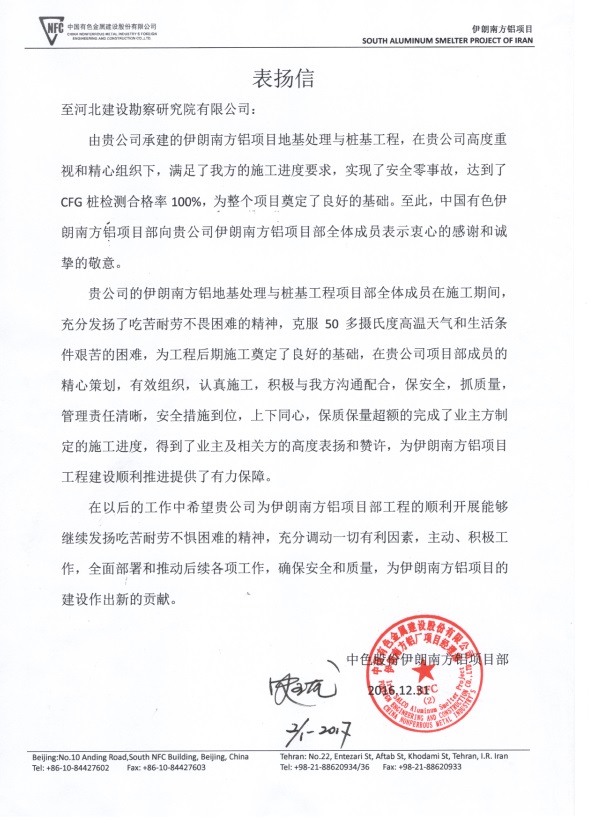 2016年12月31日,公司收到中色股份伊朗南方鋁項(xiàng)目發(fā)來的表揚(yáng)信。由我公司承建的伊朗南方鋁項(xiàng)目地基處理與樁基工程,在我公司的高度重視和精心組織下,滿足了甲方的施工進(jìn)度要求,實(shí)現(xiàn)了安全零事故,達(dá)到了CFG樁檢測(cè)合格率100%,保質(zhì)保量超額完成了業(yè)主方制定的施工進(jìn)度,得到了業(yè)主及相關(guān)方的高度表揚(yáng)和贊許。