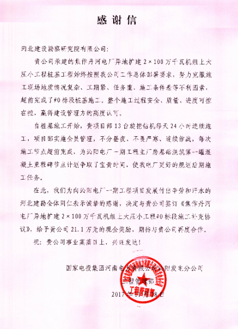 我公司承建的焦作丹河電廠異地?cái)U(kuò)建2×100萬千瓦機(jī)組上大壓小工程樁基工程,始終按照業(yè)主工作總體部署要求,努力克服施工現(xiàn)場地質(zhì)情況復(fù)雜、工期緊、任務(wù)重、施工條件差等不利因素,超前完成了#0標(biāo)段樁基施工,整個施工過程安全、質(zhì)量、進(jìn)度可控在控,贏得了建設(shè)管理方的高度認(rèn)可。11月28日,國家電投集團(tuán)河南電力有限公司沁陽發(fā)電分公司工程管理部發(fā)來感謝信,對我公司項(xiàng)目部員工表示感謝,并期待與我公司的再度合作。