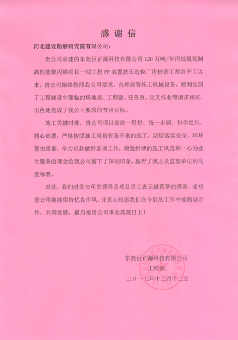 我公司承建的東莞巨正源科技有限公司120萬(wàn)噸/年丙烷脫氫制高性能聚丙烯項(xiàng)目一期工程—PP裝置擠壓造粒廠(chǎng)房、PDH裝置反應(yīng)框架鉆孔灌注樁基礎(chǔ)工程,克服了施工過(guò)程中褚多困難,按照合同節(jié)點(diǎn)圓滿(mǎn)完成施工任務(wù)。東莞巨正源科技有限公司近日發(fā)來(lái)感謝信,對(duì)公司領(lǐng)導(dǎo)及項(xiàng)目員工表示最真摯的感謝。