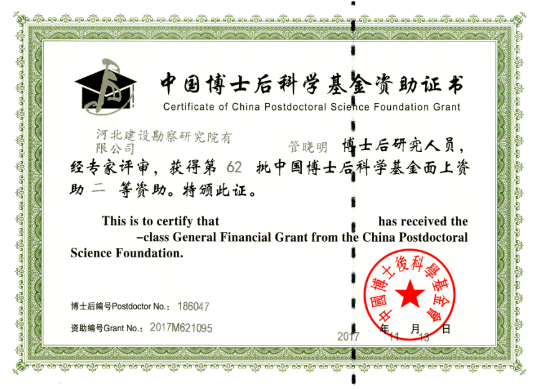 根據《中國博士后科學基金面上資助實施辦法》,公司在站博士后管曉明的《非飽和地層盾構隧道開挖面穩定性與控制研究》,榮獲中國博士后科學基金第62批面上二等資助5萬元。 中國博士后基金,旨在資助具有創新能力和發展潛力的優秀博士后研究人員,促進他們在科研工作中完成創新研究,并迅速成長為適應社會主義現代建設需要的各類復合型、戰略型和創新型人才。這是公司自建站以來,首次獲得國家級博士后基金資助,也是河北省唯一一家獲得本批資助的工作站。