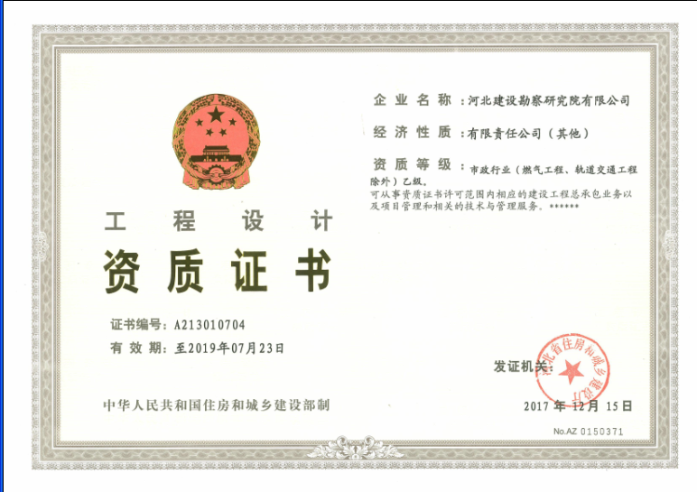 經(jīng)過艱苦努力,我公司于2017年12月15日取得了市政行業(yè)(燃氣工程、軌道交通工程除外)設計乙級資質(zhì)證書,為我公司進一步拓展相關市政設計業(yè)務,進而從事市政建設工程總承包業(yè)務創(chuàng)造了良好的條件。