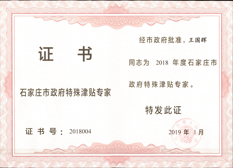 經石家莊市人力資源和社會保障局評審,石家莊市人民政府同意,我公司王國輝同志榮獲石家莊市政府特殊津貼專家稱號。