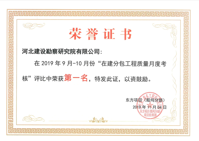 我公司俄羅斯東方船廠項(xiàng)目部,在2019年9月-10月份整個(gè)東方船廠項(xiàng)目十幾家施工單位質(zhì)量月度考核評(píng)比中,榮獲第一名的好成績。