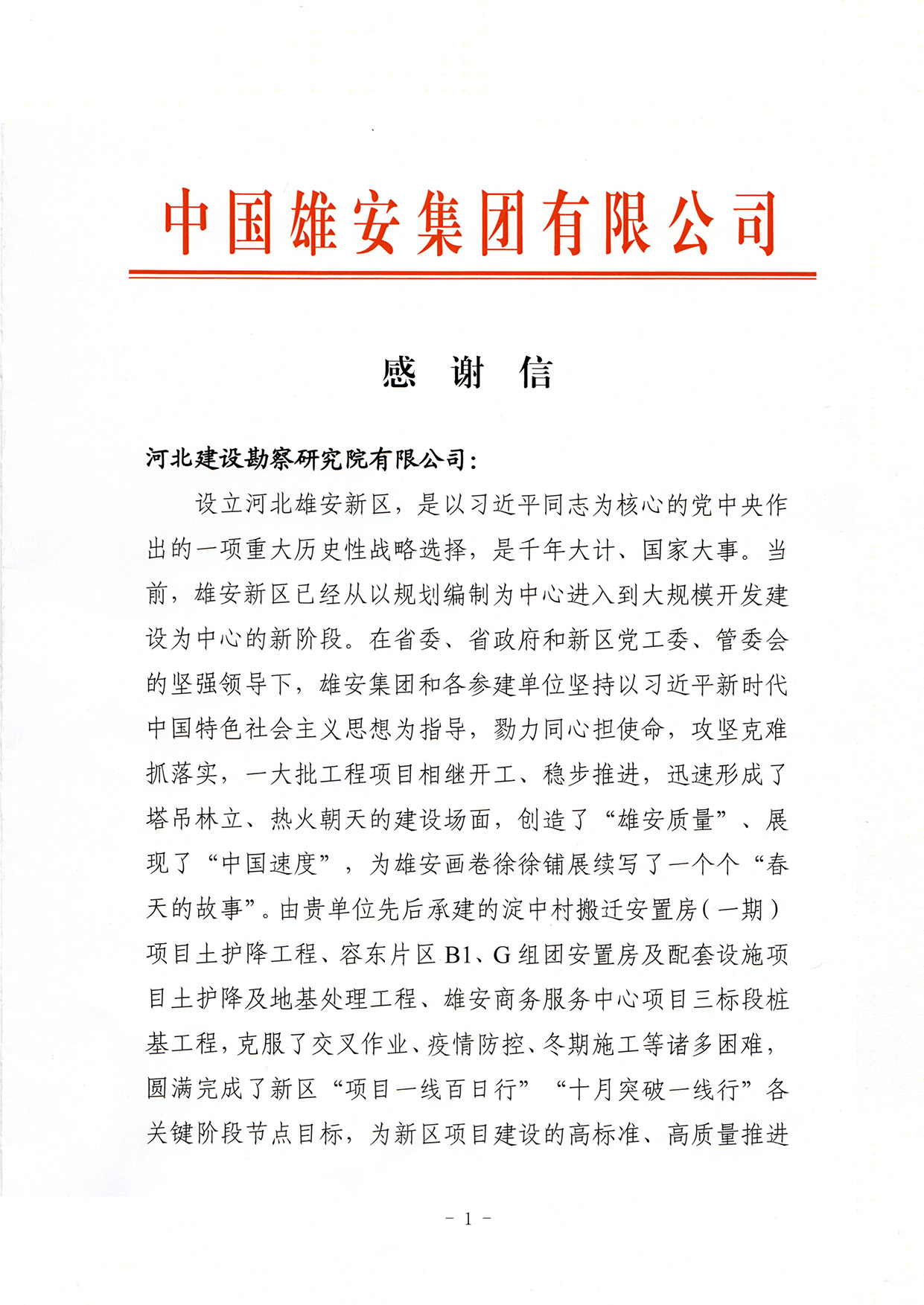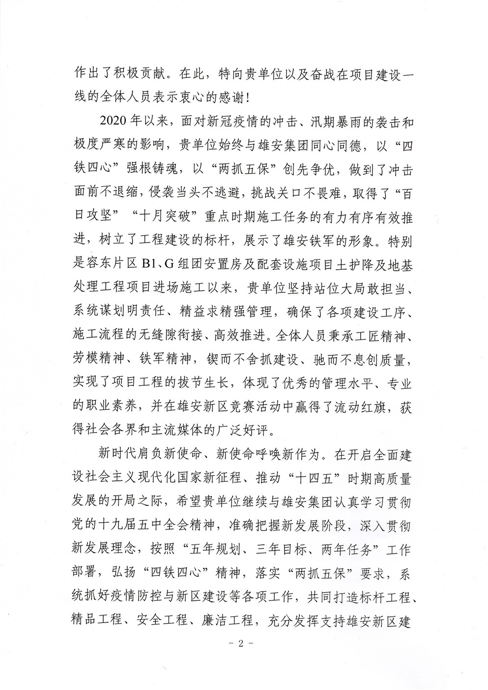 公司收到中國(guó)雄安集團(tuán)有限公司感謝信