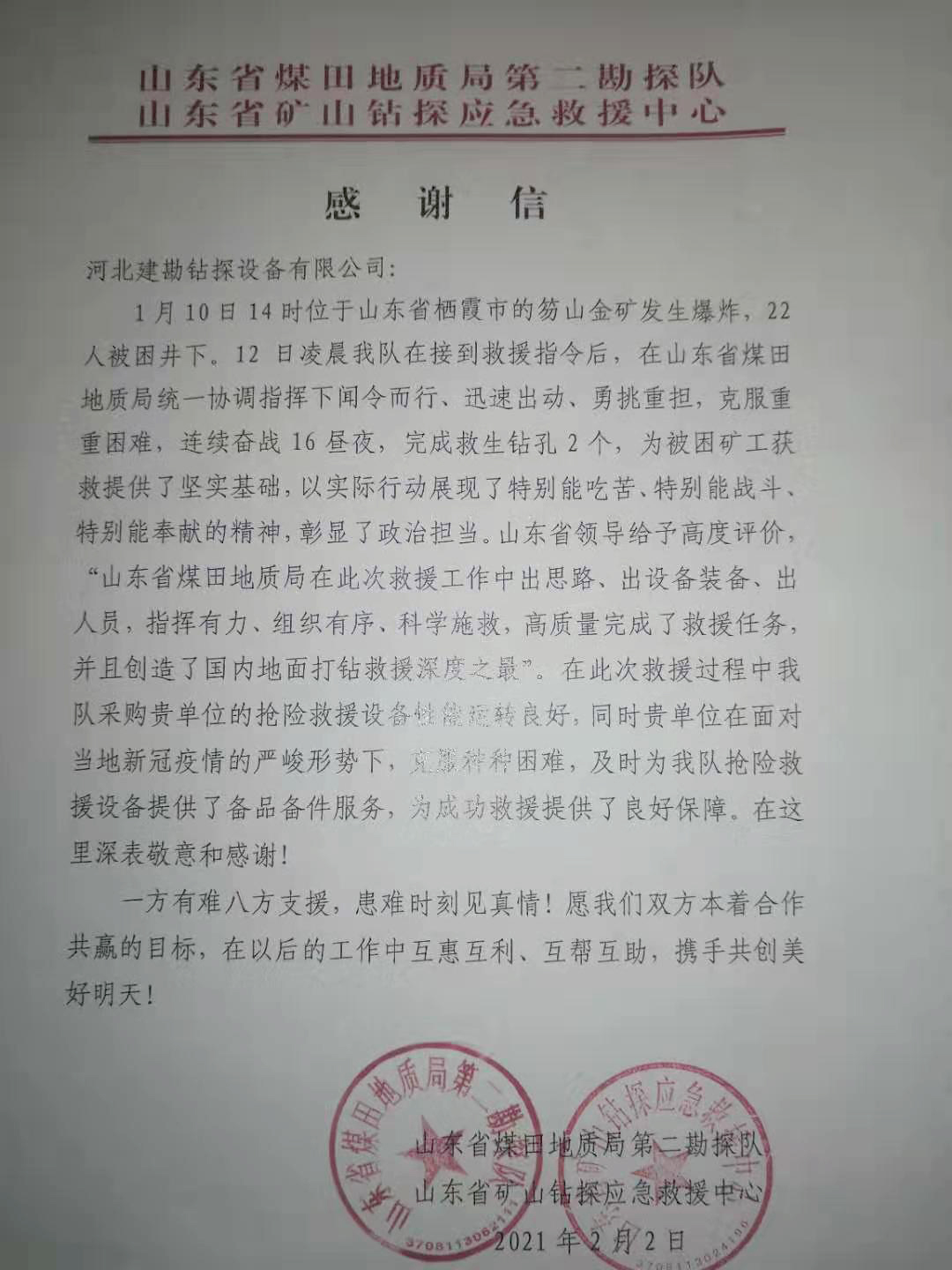 1月10日14時(shí),位于山東省棲霞市的笏山金礦發(fā)生爆炸,22人被困井下。山東省煤田地質(zhì)局第二勘探隊(duì)、山東省礦山鉆探應(yīng)急救援中心連續(xù)奮戰(zhàn)16晝夜,完成救生鉆孔2個(gè),為被困礦工獲救提供了堅(jiān)實(shí)基礎(chǔ),高質(zhì)量完成了救援任務(wù),并且創(chuàng)造了國內(nèi)地面打鉆救援深度之最。在此次救援過程中,河北建勘鉆探設(shè)備公司提供的搶險(xiǎn)救援設(shè)備性能運(yùn)轉(zhuǎn)良好,并且在面對(duì)當(dāng)?shù)匦鹿谝咔榈膰?yán)峻形勢(shì)下,克服種種困難,及時(shí)為救援隊(duì)搶險(xiǎn)救援設(shè)備提供了備品備件服務(wù),為成功救援提供了良好保障。為此,山東省煤田地質(zhì)局第二勘探隊(duì)和山東省礦山鉆探應(yīng)急救援中心在感謝信中深表敬意和感謝,并希望雙方本著合作共贏的目標(biāo),在以后的工作中互惠互利、互幫互助,攜手共創(chuàng)美好明天。