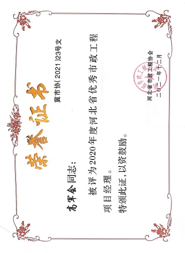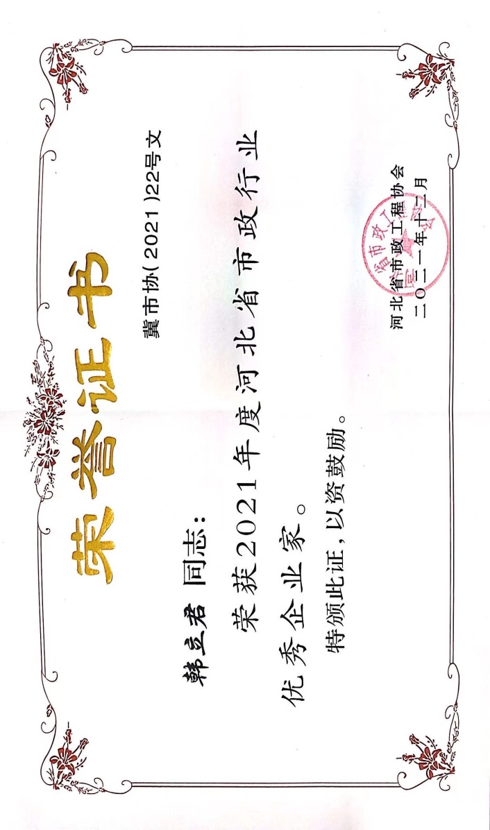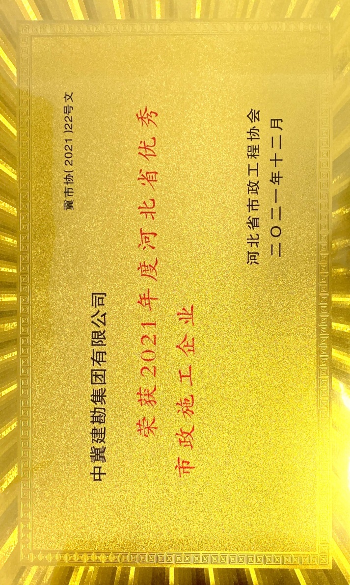 近日,由河北省市政工程協會評選,公司榮獲“2021年度河北省優秀市政施工企業”稱號;韓立君董事長榮獲“2021年度河北省市政行業優秀企業家”稱號;孫運青、狄艷林、高軍會、張海蛟四位同志榮獲“2020年度河北省優秀市政工程項目經理”稱號。
