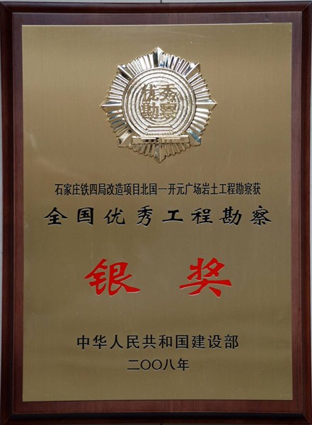 根據中華人民共和國建設部第807號文件,關于公布2006年度全國優秀工程勘察設計獎的公告,我單位石家莊鐵四局改造項目北國—開元廣場巖土工程勘察獲銀質獎。