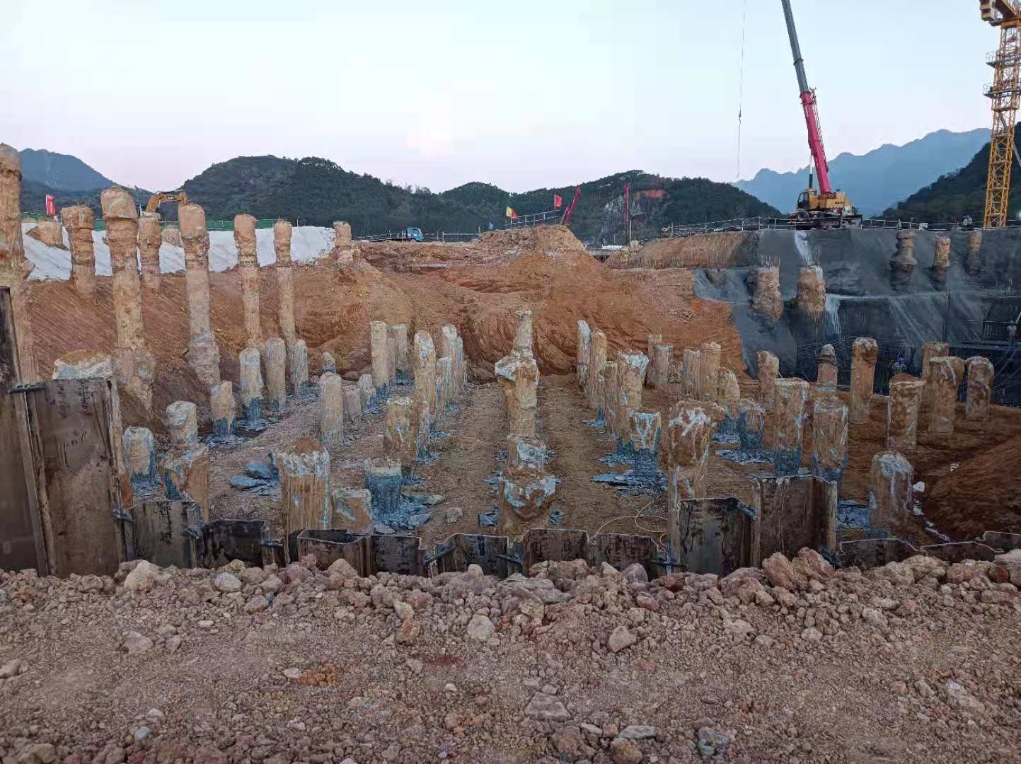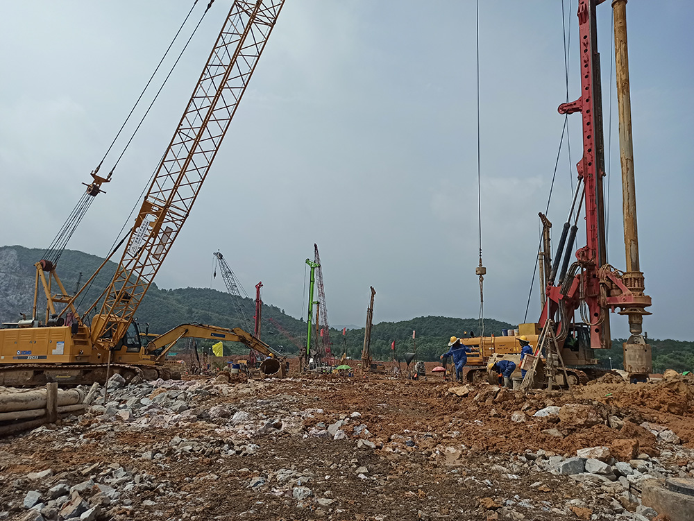 本工程于2021年04月10日開工,2022年01月27日現場樁基施工完工,工程施工期間累計投入施工人員200余人和大功率旋挖鉆機10臺以及相關匹配的機械設備。克服了雨季、高溫和地質條件復雜等諸多不利因素,累計完成鉆孔灌注樁1857根,處理溶洞約31000m³(含回填片石、水泥、C20砼及注漿和遇溶洞樁超灌混土量)。