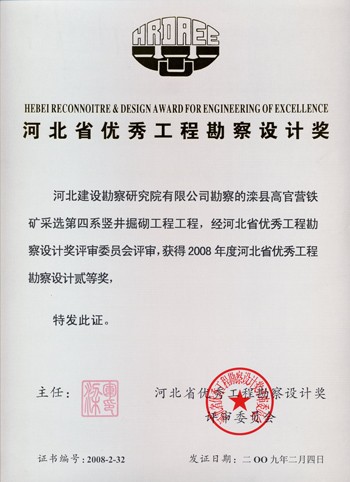 灤縣高官營鐵礦采選第四采豎井掘砌工程獲河北省優秀工程勘察設計二等獎。