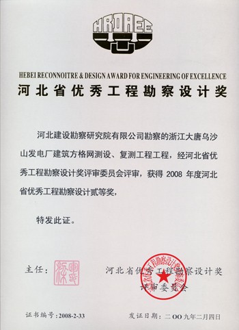 我公司承擔的浙江大唐烏沙山電廠建筑方格網測設、復測工程獲河北省優秀工程勘察設計二等獎。
