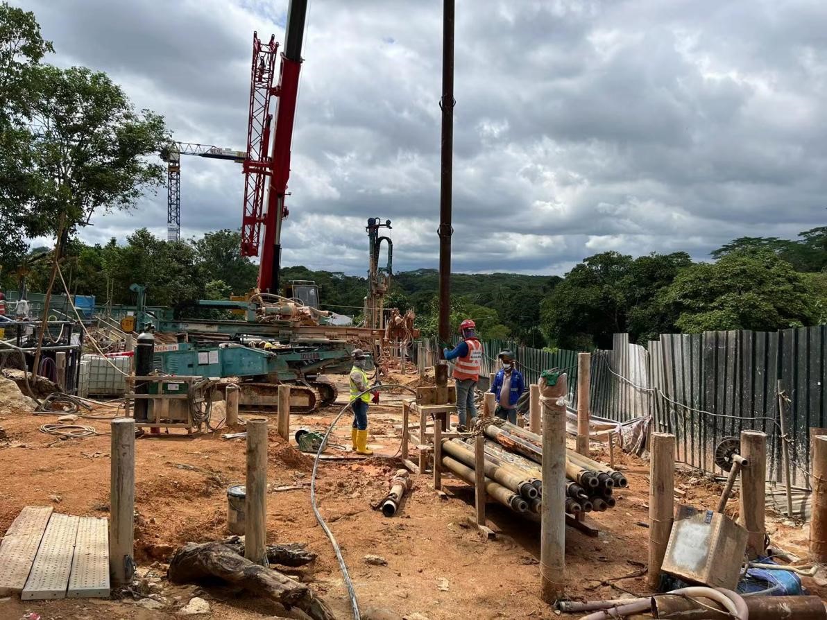 本工程位于新加坡,受SINGAPORE MANDAI PARK DEVELOPMENT PTE LTD委托,我公司負責整個項目的鉆孔微型鋼管樁的施工和試驗。本工程微型鋼管樁樁型分為300mm及250mm,其中300mm微型樁40余根,250mm微型樁50余根,樁端進入持力層為中風化巖層,共計完成90余根。