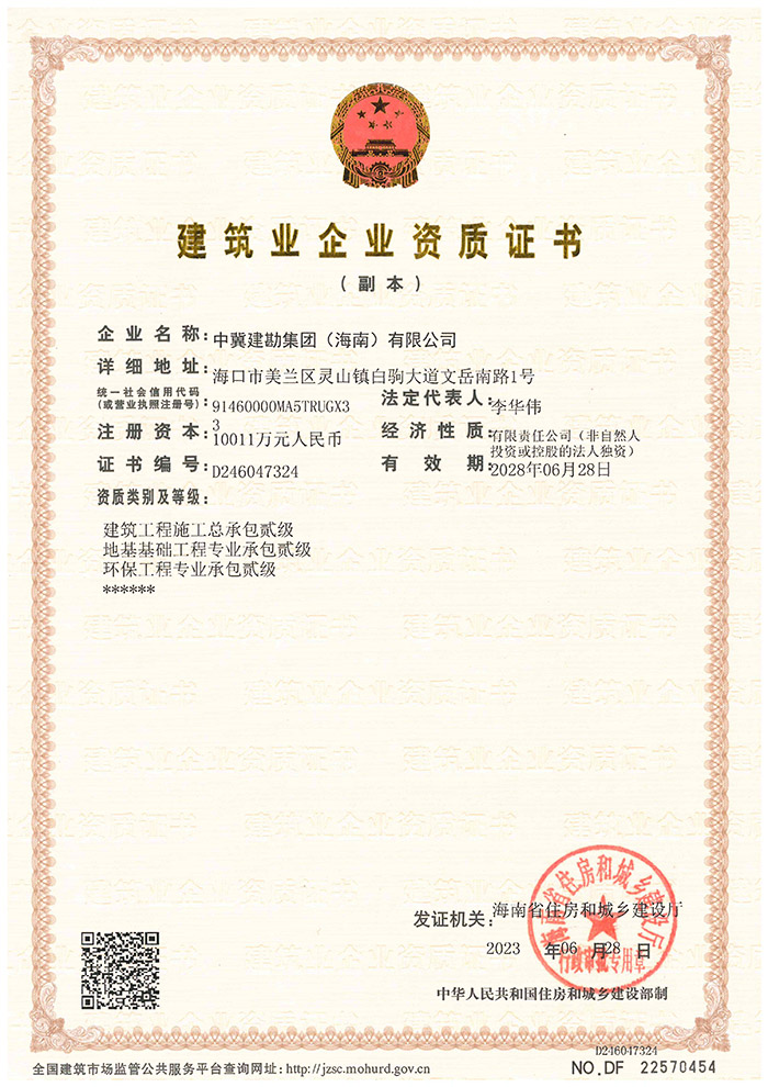 在集團公司領導的運籌帷幄下,2023年6月28日海南省住建廳通過了中冀建勘集團(海南)有限公司建筑業企業資質升級申請,順利取得建筑工程施工總承包貳級、地基基礎工程專業承包貳級和環保工程專業承包貳級資質。