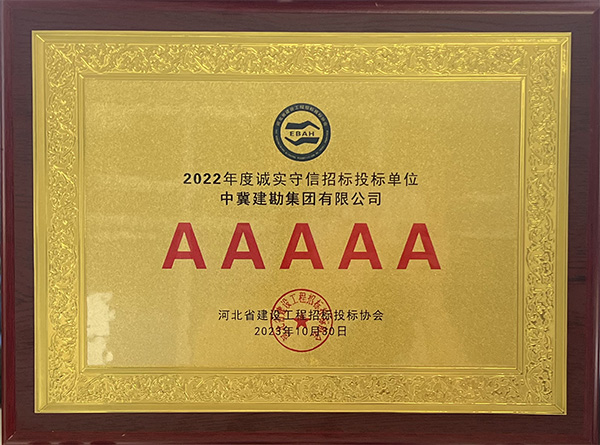 近日,我公司被河北省建設工程招標投標協會評為2022年度河北省建設工程招標投標誠實守信5A級施工企業。