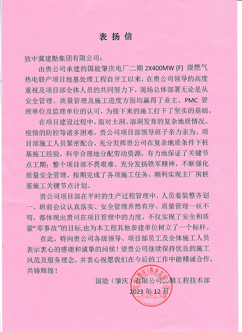 公司收到了國家電網慶陽±800千伏換流站工程由業主國家電網和監理單位河南立新及甘肅光明的聯合表揚信,表揚信中說在我公司領導的高度重視及項目部全體成員的共同努力下,高標準、高質量地完成施工任務,為后續土建單位施工奠定良好基礎,贏得了業主、監理單位的一致認可。在施工的關鍵時期,我單位項目部全體成員迎難而上,精誠協作,砥礪前行,在風雪中有建勘人不屈的脊梁,將建勘人的鐵軍精神發揮的淋漓盡致!