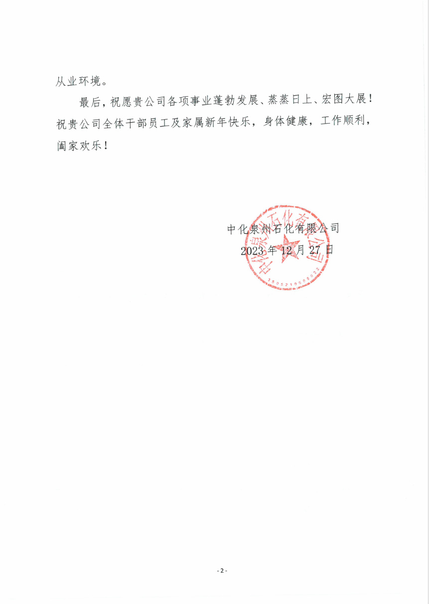 中化泉州石化有限公司為我公司發來了新年問候信,信中中化泉州石化有限公司肯定了我公司對中化泉州石化有限公司青蘭山預留地新建原油儲罐項目建設的重視;看到了我公司及項目施工人員為項目的辛勤付出;并期望在新的一年里加強合作,再創新業績。