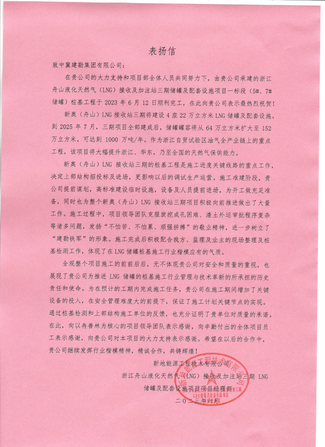 浙江舟山液化天然氣(LNG)接收及加注站三期LNG儲罐及配套設施項目(5#、7#儲罐樁基工程)于2023年6月25日收到新地能源工程技術有限公司發來的表揚信。自開工以來,在公司的大力支持和項目部全體員工的共同努力下,精心組織、全力布局,克服了前期施工任務重等諸多困難,安全、高效、優質的完成了儲罐的樁基施工任務,有力保障了本項目總體工期計劃,贏得了監理單位和業主單位的一致認可和好評。