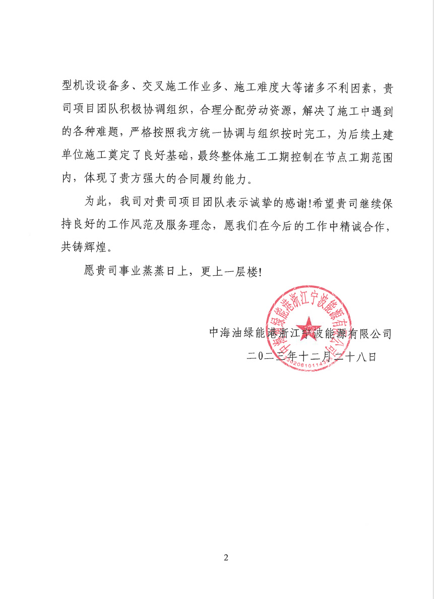 連云港榮泰化工倉儲有限公司倉儲罐區工程(五期)項目二標段樁基工程,業主在表揚信中說:貴公司克服工程建設中面臨的場地緊張、疫情嚴、任務繁重等諸多困難,安全、高效、優質的圓滿完成了施工任務。貴公司項目部全體員工克服重重困難,精心謀劃,精心施工。特別是在施工中所表現出的管理水平及敬業精神,令人欽佩。