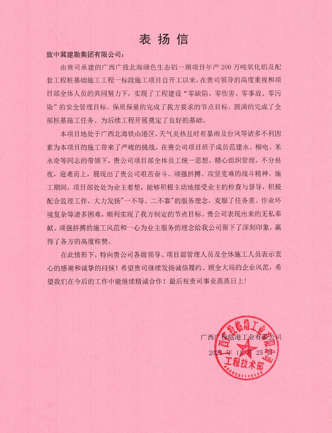 廣西北海氧化鋁項目樁基工程工程自2023年2月24日開工,至12月15日完成合同內全部樁基施工任務,在此期間,項目部全體成員一直堅持安全第一的理念,實現了工程建設“零缺陷、零傷害、零事故、零污染”的安全管理目標,施工過程中克服種種困難,順利實現了業主方制定的節點目標,獲得業主單位的肯定與褒獎,送出表揚信,為主要管理人員頒發獎狀。為后續施工工作的開展提供了可靠保障,贏得了業主及相關各方的認可。