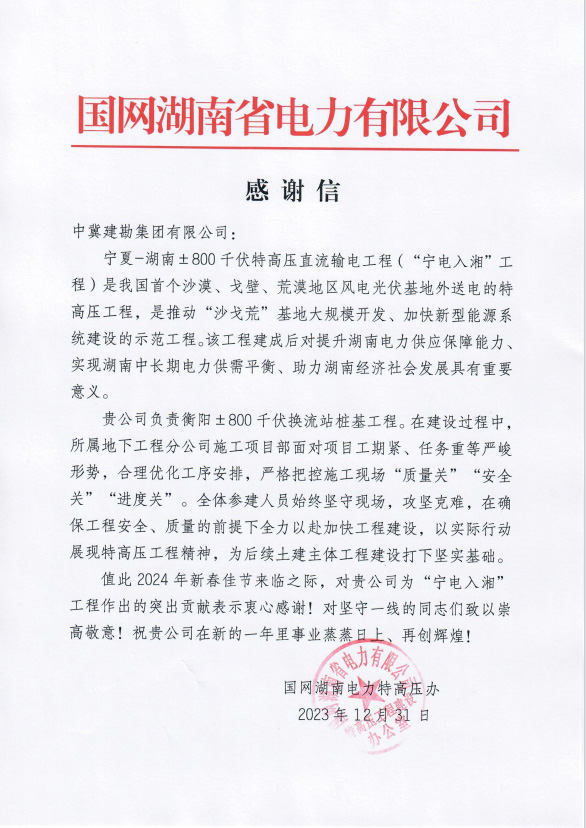 國家電網湖南電力特高壓辦,為我公司承建的衡陽±800千伏換流站工程樁基項目部發來感謝信一封。感謝信內容主要表達了,面對項目的工期緊,任務重等關鍵形勢,稱贊我公司能嚴格把質量關,安全關和進度關。