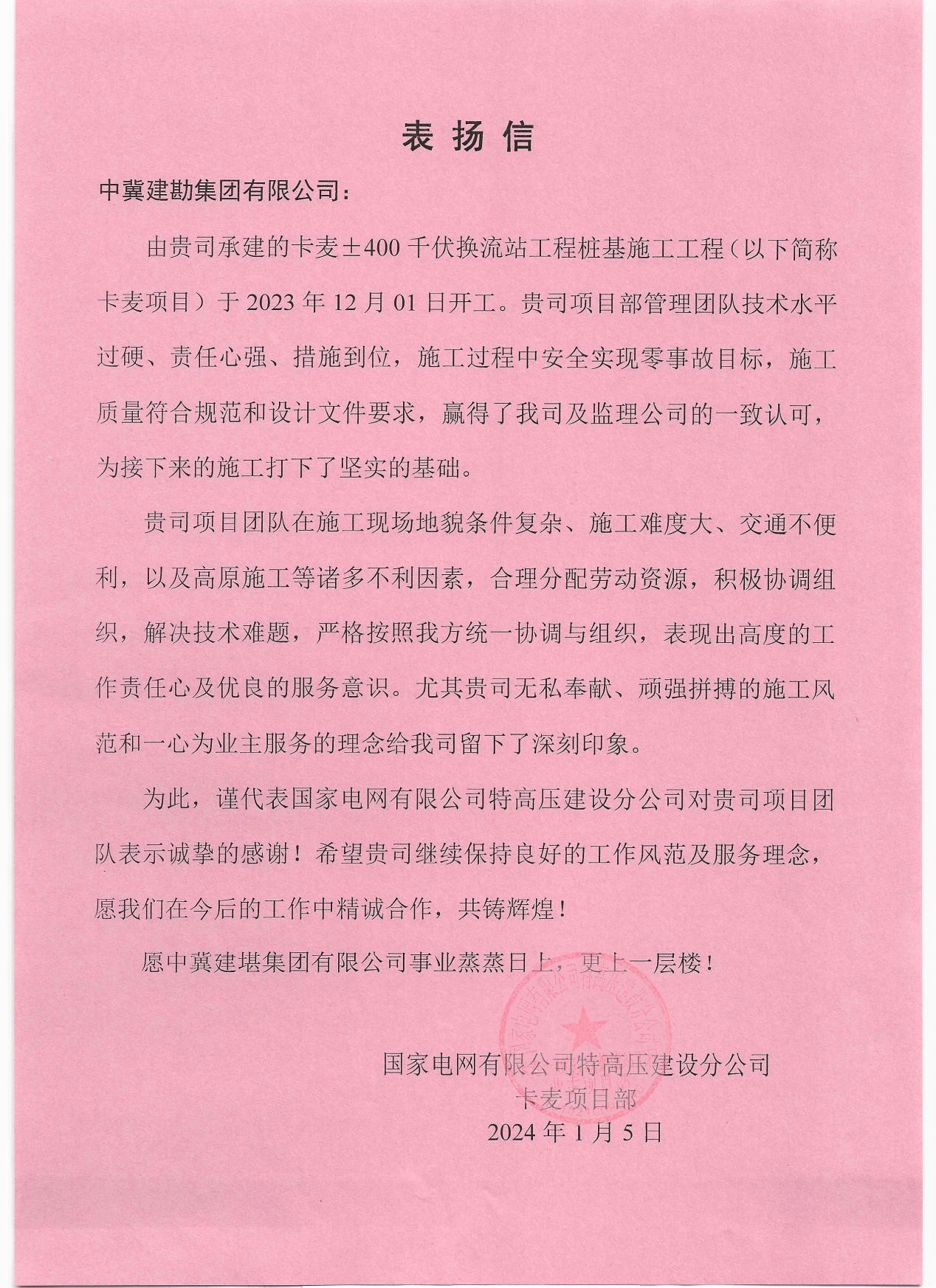 卡麥±400千伏換流站工程樁基施工工程收到業主國家電網有限公司特高壓建設分公司發來的表揚信。項目部敢打硬仗的精神面貌,贏得了業主方的高度贊賞和認可。