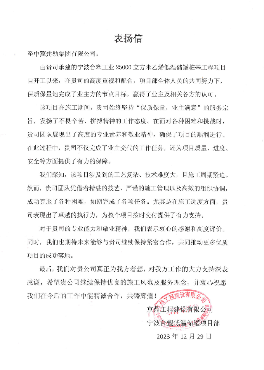 寧波臺塑工業25000米方米乙烯低溫儲罐樁基工程項目,自開工以來,項目部全體人員始終堅持“保質保量,業主滿意”的服務宗旨,發揚了不畏辛苦、頑強拼搏的精神。在面對各種困難和挑戰時,憑借精湛的技藝、嚴謹的施工管理以及高效的組織協調,克服了各種困難,展現出了高度的專業素養和敬業精神,確保了項目順利進行,贏得了業主及相關方的認可。