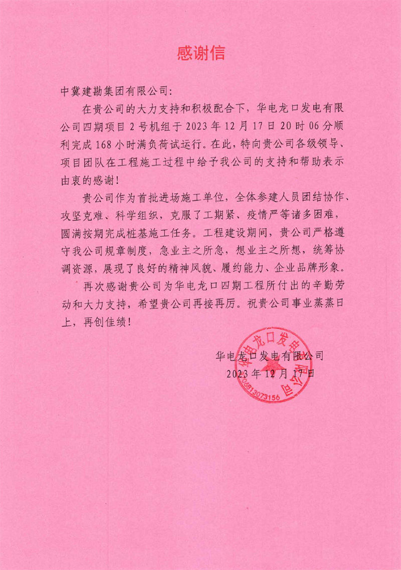 華電龍口發電有限公司四期項目2號機組于2023年12月17日20時04分順利完成168小時滿負荷試運行。工程建設期間,完成了各項安健環活動,并在安全管理方面取得良好的效果,贏得了業主方認可。我公司人員嚴格遵守我公司規章制度,急業主之所急,想業主之所想,統籌協調資源,展現了良好的精神風貌、履約能力、企業品牌形象。為此,業主特向我公司各級領導、項目團隊在工程施工過程中給予的支持和幫助表示由衷感謝。