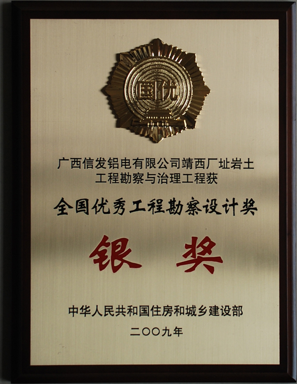 2010年7月6日,住房和城鄉(xiāng)建設(shè)部在北京召開2008年度全國優(yōu)秀工程勘察設(shè)計(jì)獎(jiǎng)?lì)C獎(jiǎng)大會,我公司“廣西信發(fā)鋁電有限公司靖西廠址巖土工程勘察與治理”項(xiàng)目被授予全國優(yōu)秀工程勘察設(shè)計(jì)銀獎(jiǎng)獎(jiǎng)牌。