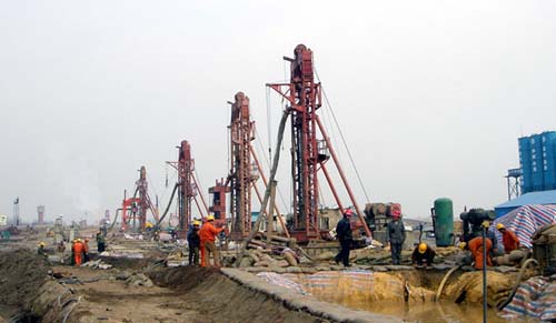 工程地點位于武漢市天興洲。施工時間2005年1月至2006年4月。引橋7#、9#、10#、11#墩,樁徑1.5m、樁長65-70m,72根,樁端嵌入弱膠結泥質礫巖近30m,巖石強度14MPa。01#-09#φ2.5m鉆孔,樁長65-75m,95根樁端嵌入強膠結泥質、鈣礫巖約40m,巖石強度20-60MPa,施工難度極大。